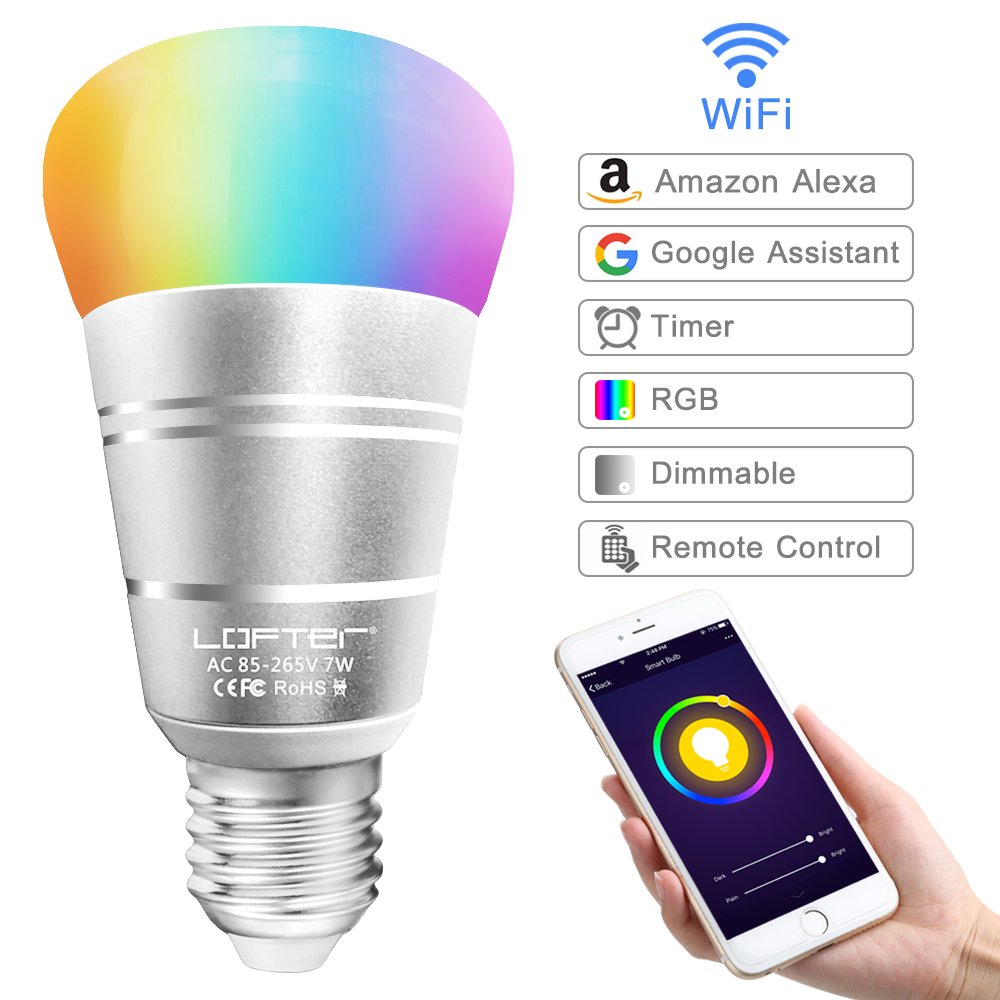 Lampadina Intelligente, LOFTer Lampadina Smart WiFi E27 RGB 7W, Lavora con Echo Alexa/Google Home, Luce Regolabile Compatibile per Dispositivo iOS Android App Controllata